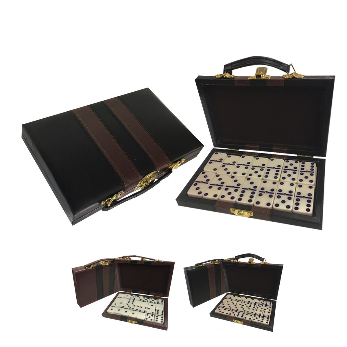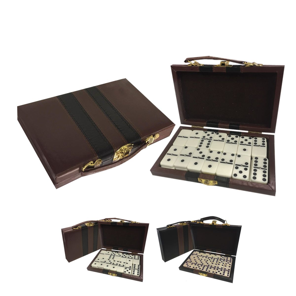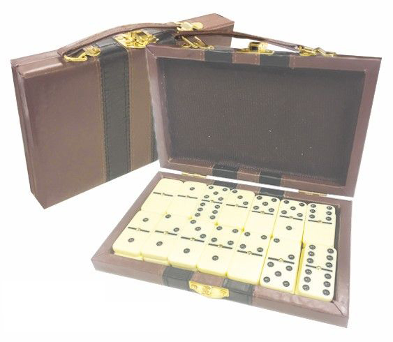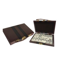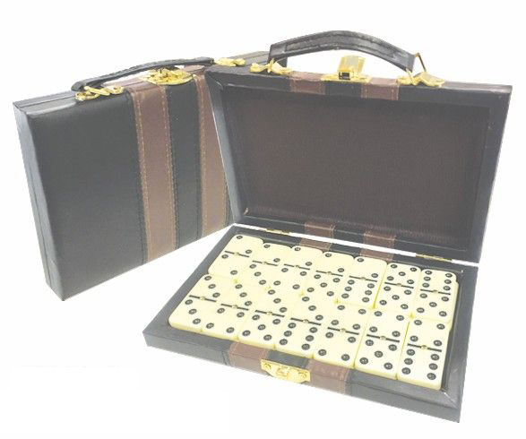 Large official size 28 Piece Double Six Domino Set & Attaché Case. This large domino set features dominoes with metal spinners and an attractive attached storage case. This is a full double six 28 piece domino set. The cases are available in tan or black and the domino pieces are ivory colored. The logo is customized on the 7 1/2'' x 4 3/8'' x 1'' case. An excellent Latin and Spanish promotions.