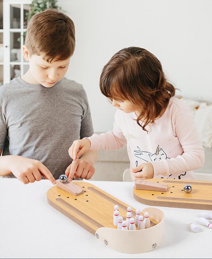Our wooden desktop bowling game toy is made from high quality wood with no harm to the environment. The bowling game is easy to set up and fun to play. Place the wooden base on a level and horizontal surface, stand up the 10 mini bowling pins, and position the ramp in the desired direction, then send the ball rolling down. This small bowling game toy set keeps children away from electronic products and focuses their attention on playing bowling games. Parents and children can play games together to increase parent-child interaction time.