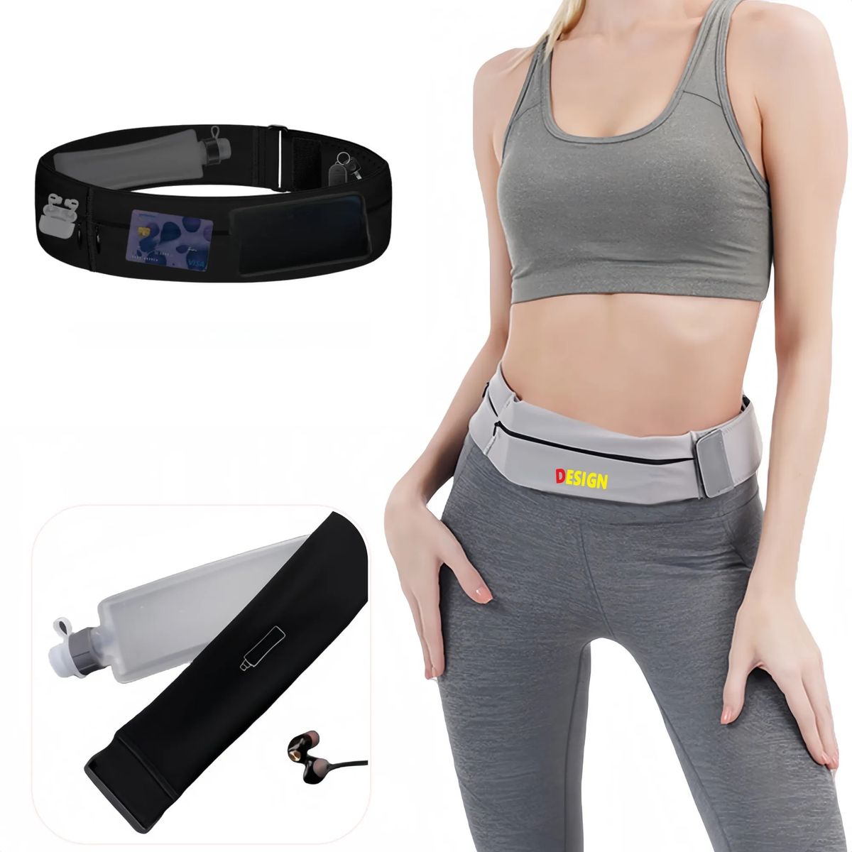 This adjustable running belt with water bottle holder features a bounce-free design for maximum stability during runs cycling or hiking. Three spacious pockets securely hold essentials like phones keys cards cash and headphones. The smooth zipper prevents jams and item loss while keeping valuables accessible. Lightweight yet durable it stays comfortably in place during workouts. Ideal for jogging biking or travel with screen-printed logo for style.
