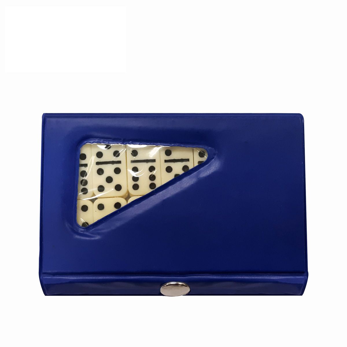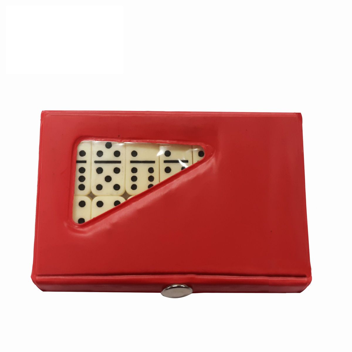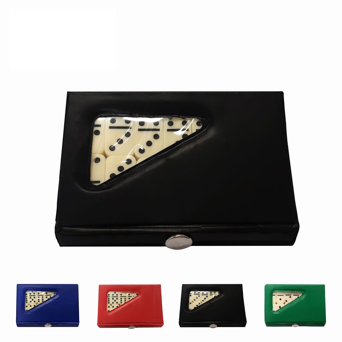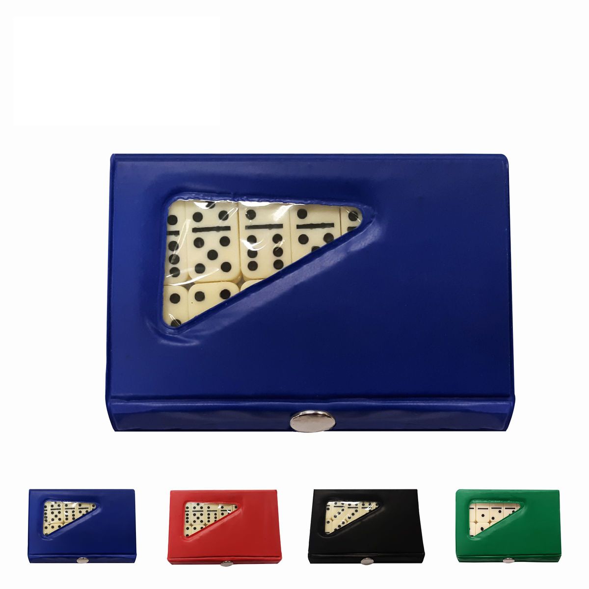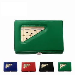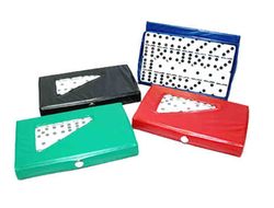 This compact domino game features a full set of double six dominoes in an attractive case. The cases come in colors of blue, red, green and black; sold in individual colors or assorted. The domino playing chips are ivory colored. The case measures 4 1/4" x 2 1/2" x 1/2" and the size of the domino chip is 1 1/8" x 1/2" x 1/8". Perfect for Latin and Spanish promotion.